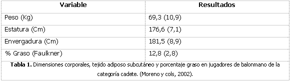 En la tabla 1 Moreno y cols. (2002) realizaron un estudio de las dimensiones corporales, tejido adiposo y el porcentaje graso de jugadores de Balonmano de edades comprendidas entre 13 a 21 teniendo los siguientes resultados de la categoría cadete.