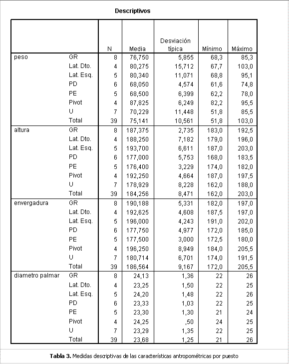 3. Análisis estadísticoSe realizó un análisis descriptivo de cálculo de medias, desviaciones típicas, mínimo y máximo de las variables analizadas, es decir se analizó descriptivamente el comportamiento de la altura, peso, envergadura, %grasa, masa magra, masa grasa y diámetro palmar. Después de haber contrastado la normalidad de las variables, se realizó un estudio más exhaustivo de la existencia de diferencias significativas en la distribución de las variables según los distintos grupos (puestos) utilizando el modelo de Análisis de la Varianza (ANOVA) y la prueba no paramétrica de Kruskall-Wallis.