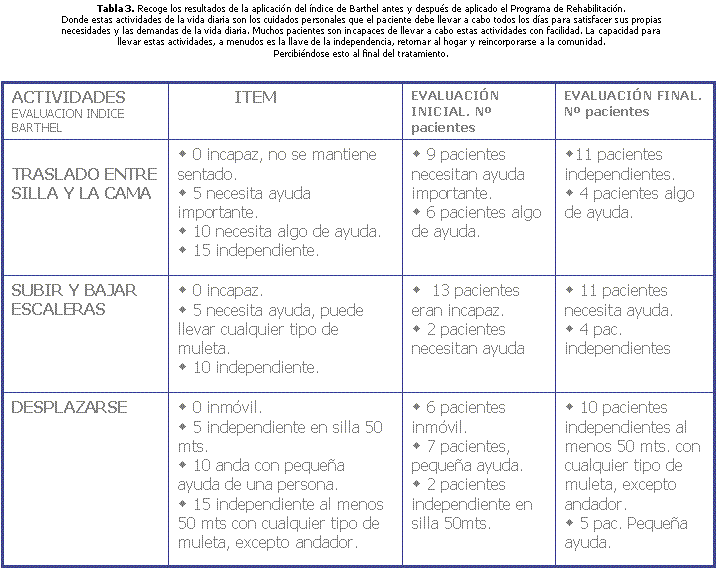 Los resultados que arrojan las pruebas seleccionadas del índice del Barthel (traslado entre silla y cama, subir y bajar escaleras y desplazarse) también son alentadoras ya que el nivel de independencia en la realización de estas actividades al final del tratamiento fueron positivas.