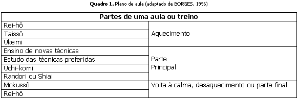 e a organização didática da aula e do treino de Judô, obedecendo as estrutura convencional da uma aula de EF considerada a ideal para o "modelo" de educacional existente na épocas de sua criação.