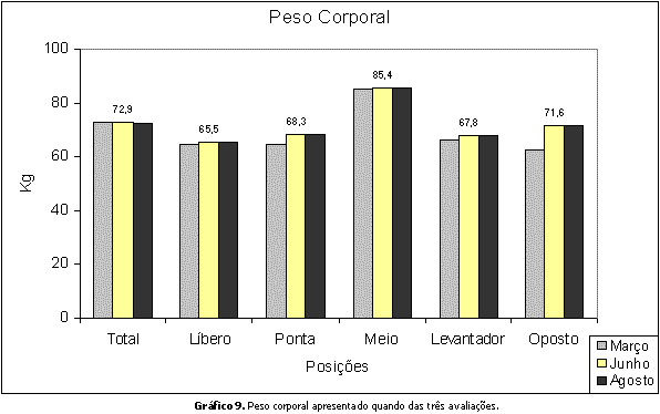 Para a avaliação do peso corporal para os indivíduos avaliados observamos que os avaliados da posição de meio apresentaram, em todas as ocasiões peso corporal acima dos demais. Para os jogadores da posição de líbero estes valores foram os mais baixos encontrados quando das avaliações, enfatizando a principal capacidade desta posição que é a agilidade para realização das defesas e consequentemente a capacidade de agilidade deve ser mais acentuada. Estes valores estão apresentados no gráfico 9.