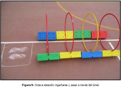 8ª estación. Agacharse y pasar a través del túnel: Se ensamblan cada uno de los aros con dos ladrillos de plástico uno a cada lado, situando cada una de las estructuras una a continuación de la otra formando con ello un túnel (figura 9).