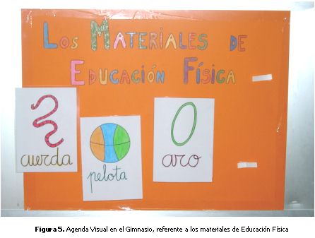 Desde el área de Educación Física, en el gimnasio coloqué una cartulina la cual poseía diferentes tipos de materiales, teniendo en cuenta los que más usaría y los que más le motivaban (pelotas, aros y cuerdas). Así, al ir a coger el material este alumno me acompaña indicándole que material vamos a usar, provocando en el alumno la conducta comunicativa diciendo el nombre del material y el color del mismo.