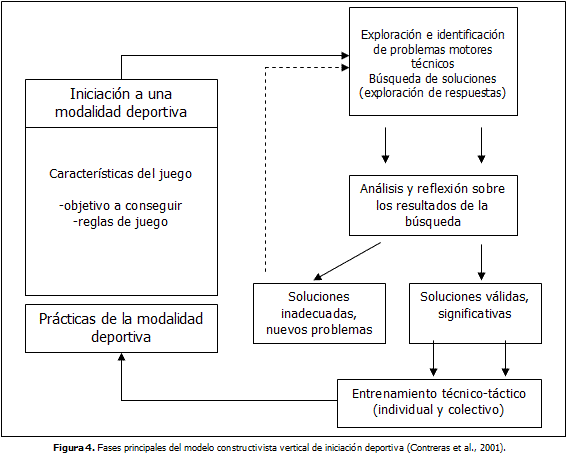 Modelo constructivista vertical de la enseñanza deportivaLa diferencia de este modelo con el anterior recae, al igual que en el modelo comprensivo, en el tratamiento de una sola modalidad deportiva. Podemos decir que en este modelo el jugador se va especializando en los elementos o medios técnico-tácticos de dicha modalidad deportiva, pero siempre desde un punto de vista constructivo "…de lo que se trata es de inducir, de manera paralela a la práctica, procesos de percepción, exploración, análisis y reflexión que vayan familiarizando al alumnado con los aspectos estratégicos de la actividad deportiva planteada y con la búsqueda de soluciones a los problemas que surgen durante la práctica" Contreras et al., (2001).