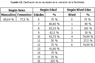 En este cuadro se observa que en cuanto al sexo las hembras poseen mayor flexibilidad que los varones, con una diferencia de (7,86%), se nota una relación inversa en cuanto a la edad, donde a mayor edad menor porcentaje de flexibilidad, de manera general, este patrón no es tan claro al apreciar la clasificación según el nivel educativo, donde los porcentaje son variables.