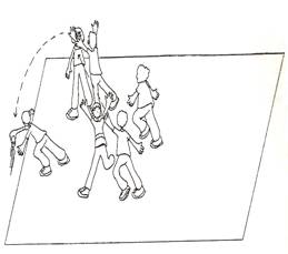 Botando voy y botando vengo: Se forman grupos de seis jugadores. Cada dos equipos realizarán el juego entre sí, con una pelota gigante (la adecuada para este juego será entre 75 y 85 cm., ya que las pelotas gigantes de mayores dimensiones, dificultarían mucho la ejecución de los botes y harían muy lento el desarrollo del juego). El terreno es el ancho de un campo de balonmano. Un jugador de cada equipo, se situará detrás de la línea de fondo del campo contrario. El objetivo es hacer llegar la pelota gigante al que se encuentra al otro lado de la línea de fondo. El inicio del juego se realizará mediante un lanzamiento hacia arriba de la pelota gigante. La manera de desplazarse será botando el balón, y la interacción con los compañeros será mediante pases. En caso de infracción la pelota gigante se pondrá en juego desde el lugar de la infracción. El jugador situado detrás de la línea, recibe la pelota gigante y si no se le cae se anotará un punto su equipo. Cada vez que esta situación se produzca, es decir, se consiga un tanto, los dos equipos deberán cambiar al jugador situado en la línea de fondo. |