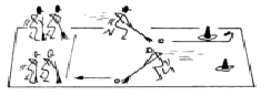 Mini circuito: Los grupos frente a una hilera de tres o cuatro conos. Conducir la pelota con ambos lados del stick en zigzag. Al regresar se entrega la pelota y así sucesivamente |