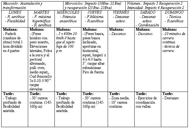 Siguiendo este modelo el esquema general de distribución de las cargas para nuestra deportista fue la que se presenta a continuación: