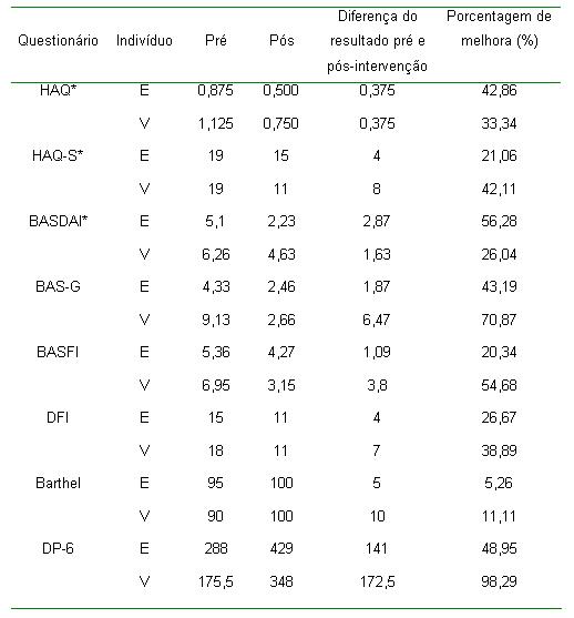 Resumo A Espondilite Anquilosante é caracterizada por um acometimento progressivo das articulações sacroilíacas e esqueleto axial, resultando em imobilidade e rigidez. Objetivou-se com este estudo verificar os efeitos de um programa de fisioterapia aquática na capacidade funcional e qualidade de vida de indivíduos com Espondilite Anquilosante. Concluíram o estudo dois indivíduos, um do sexo masculino e um do sexo feminino. Os indivíduos foram inicialmente submetidos à avaliação fisioterapêutica, testes e questionários de avaliação de capacidade funcional (DP-6, HAQ, HAQ-S, BASDAI, BAS-G, BASFI, DFI, Índice de Barthel) e qualidade de vida (SF-36). Após, os indivíduos foram submetidos a um programa de exercícios de fisioterapia aquática, por 24 semanas, três vezes por semana, com duração de uma hora cada sessão. Após, os indivíduos foram novamente reavaliados. Ambos indivíduos apresentaram melhora nos escores de todos os questionários utilizados. Analisando os escores do SF-36, a melhora percentual média foi de 30% na capacidade funcional, 12,5% no aspecto funcional, 10% na dor, 32% no estado geral de saúde, 23,25% na vitalidade, 35,5% no aspecto social, 50% no aspecto emocional e 46% na saúde mental. A melhora foi de 38,10% no HAQ, 63,17% no HAQ-S, 41,16% no BASDAI, 57,03% no BAS-G, 37,51% no BASFI, 32,78% no DFI, 16,37% no Índice de Barthel e 73,62% no teste DP-6. Apesar do tamanho reduzido da amostra, o estudo comprova que um programa de exercícios de fisioterapia aquática influencia positivamente a capacidade funcional e qualidade de vida de indivíduos espondilíticos. Unitermos: Espondilite anquilosante. Fisioterapia aquática. Capacidade funcional