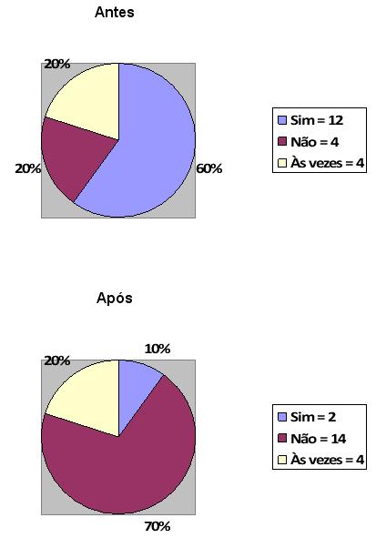 Inicialmente, 50% dos alunos acreditavam que o alongamento aliviaria ou até inibiria as dores sentidas durante ou após as atividades, 45% às vezes e 5% não acreditavam. Ao término do trabalho 90% acreditavam no alívio da dor, 5% não acreditavam e 5% às vezes.