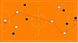 Objetivo – Flutuação, concentração, antecipação, cobertura, atenção, retorno, marcação com desvantagem numérica e concentração. Descrição – Jogo de futsal, mais a quadra é divida pela metade, em cada meia quadra dois defensores e três atacantes. Os jogadores não podem mudar de quadra, apenas a bola troca de quadra. |