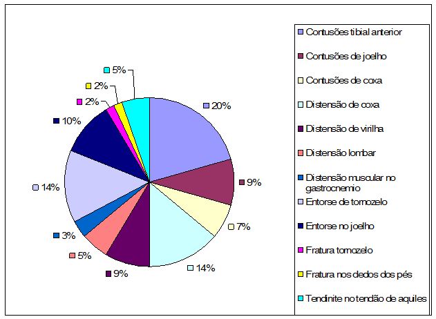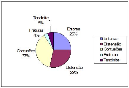 Para uma melhor visualização dos dados coletados, apresentam-se no gráfico 02 as lesões classificadas segundo a sua etiologia. Onde se observa que a maior incidência é a de contusão (37%), seguida de distensão muscular (29%) e em terceiro o entorse (25%).