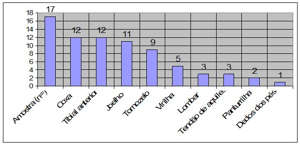 Em relação ás lesões, as atletas relataram que já tiveram muitas lesões devido á prática de futsal, totalizando 58 (cinqüenta e oito) lesões osteomioarticulares, sendo que as lesões mais encontradas foram as contusões no tibial anterior 20% (n=12), distensão da coxa com 14% (n=8), entorse de tornozelo com 14% (n=8) e entorse do joelho com 10% (n=6).