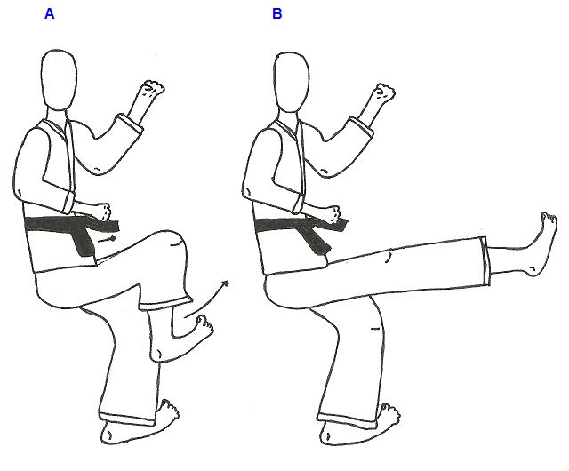 Figura 7. (A) Karateca fazendo extensão do joelho e báscula anterior da pelve (ver a seta), (B) em seguida realiza o chute