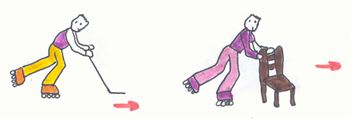 Cada niño con un stick lo va empujando delante suyo. Esta situación obliga al niño a adoptar la actitud de base del patinador: rodillas flexionadas hacia delante y espalda inclinada.