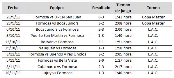 Durante la Liga Argentina de Voleibol Masculino A2 de 2005-2006 contabilizamos los saltos al equipo La Unión de Formosa durante 5 partidos.