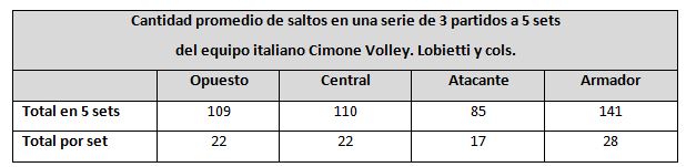 Lobietti y cols. analizaron los saltos que efectuaron los jugadores de voleibol del equipo italiano Cimone Volley en 3 partidos a 5 sets.