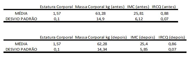 Os participantes do projeto foram avaliados na própria instituição quanto ao peso, estatura, análise postural e IRCQ. Os dados referentes à massa corporal e estatura foram utilizados o calculo de IMC e os avaliados classificados como sobrepeso ou obesidade segundo a Organização Mundial de Saúde (ACSM, 2006). Além desses dados, foram verificados alguns dados subjetivos como a auto-estima, comportamento social, dentre outros.