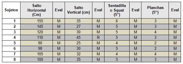 Teniendo en cuenta los resultados alcanzados por las diferentes muestras, expresan el bajo nivel de la condición de fuerza en función de alcanzar mejores resultados y al mismo tiempo poco desempeño en los rangos de la fuerza explosiva.