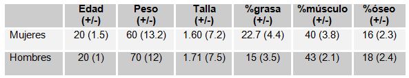 El promedio de edad de ambas muestras fue de 20 años; la composición corporal nos muestra peso y talla menores para las mujeres, así como mayor adiposidad y menor masa muscular y ósea que los hombres, lo que se ve reflejado en el somatotipo de esta población estudiantil (Tabla 1).