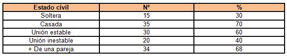 En la tabla 2 se muestra el estado civil de las embarazadas, arrojó que 35 son casada para un 70 % y 15 solteras (30 %), son estables en su pareja 30, mientras que 20 (40%) son inestables, lo que nos es curioso que 34 tuvieron más de una relación (68%), esto demuestra que se confirma una vez más que una de los motivos de las sepsis e infecciones de transmisión sexual es el cambio de pareja frecuente durante su vida y sin una adecuada protección. En este aspecto coincido con el Centro Nacional de Higiene y Epidemiologia que en Cuba más del 80% de las mujeres son motivo de consulta por esta causa y Benton y brzychczy que la promiscuidad es el factor de riesgo más importante para adquirir la infección vaginal. Estudios realizados en el municipio sobre la sepsis vaginal y sus riesgos arrojaron que la promiscuidad ocupa un papel importante (13,14).