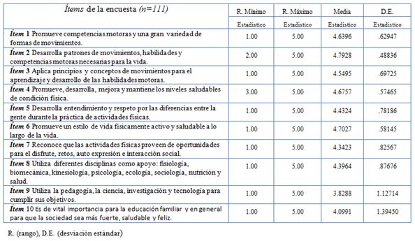 El análisis descriptivo nos muestra rangos de 1 a 5 en la mayoría de los casos, mostrando una promedio máxima de 4.7 para el ítem 2 e ítem 6 y una mínima de 3.8 para el ítem9 (ver tabla , por lo cual podemos notar que la mayoría de los encuestados considera importante el desarrollo de patrones de movimiento, habilidades y competencias motoras necesarias para la vida, así como la promoción de un estilo de vida físicamente activo y saludable a lo largo de la vida, pero no así el uso de la pedagogía, ciencia, investigación y tecnología, lo cual es considerado solo como algo importante. Estos resultados nos pueden dar indicios sobre una falta de postura pedagógica, científica y tecnológica que tienen los encuestados sobre la educación física.
