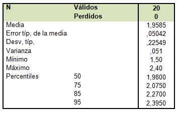 Las pruebas descriptivas realizadas con el SPSS (Tabla 1) han determinado la existencia de una Media Aritmética o Promedio de los sujetos estudiados de 1,9585 en la Prueba de Equilibrio Dinámico, con un valor Mínimo de 1,50 y Máximo de 2,40. Por otra parte, los percentiles se establecieron de la siguiente manera: Percentil 95: 2,3950; Percentil 85: 2,2700; Percentil 75: 2,0750 y Percentil 50: 1,9800.