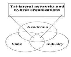 No modelo da hélice tríplice, a interação entre os atores promove uma infraestrutura de conhecimento que alicerça o desenvolvimento das regiões. As relações que se processam permitem às instituições exercerem o papel da outra, produzindo organizações híbridas que emergem das interfaces. Observe a figura 3.