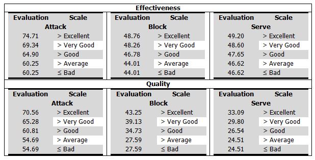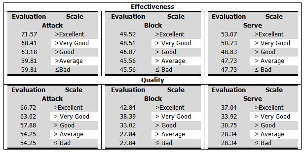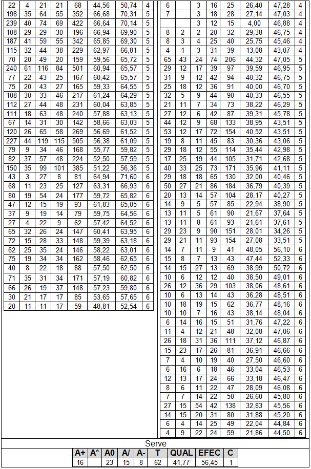 Table 4 describes the mathematical values obtained from the percentiles. In the case of the values obtained from the effectiveness calculations (EFEC, Tabla 3), it is noted that to reach the evaluation of Excellent every female player must have a numerical level higher than 71.57%, in Block Excellent must surpass 49.52% and in Serve over 53.07%. On the other hand, the Quality calculations scales (Qual, table 3) establish that to have the evaluation of Excellent in Attack, the level needed must surpass 66.72%, in the case of the Block skill over 42.84% and in Serve over 37.04%.