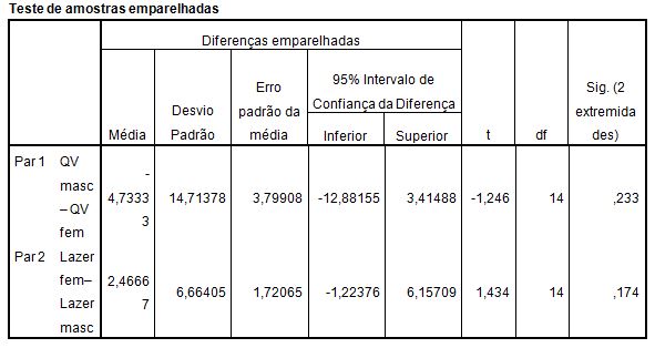 Quando comparamos as médias entre masculino e feminino pelo teste T, com relação a prática de atividades de lazer o resultado foi p = 0,174. Mostrou-se que não existe diferença significativa entre os gêneros.