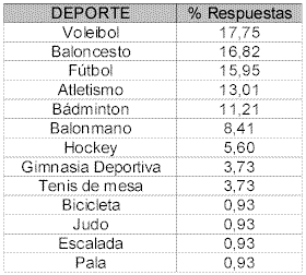 Cabe destacar que, entre los deportes practicados, el Atletismo atrae a los alumnos en menor medida de lo que es practicado en clase de EF. Habría que analizar si la metodología utilizada para desarrollar este deporte es motivante o no, si el Atletismo es una laguna en la formación del docente... Igualmente, el Balonmano cae en la demanda del alumnado respecto a la práctica en clase, viéndose superado por otros deportes como el Hockey o el Tenis de mesa.