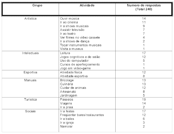 O resultado encontrado na escolha das atividades utilizadas com mais freqüência para o lazer como as atividades manuais, pode ter ocorrido por estas atividades estarem relacionadas com a vida diária, como o cozinhar, bricolagem, jardinagem e artesanato.