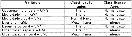 Gráfico 3. Perfil motor antes e após as intervençõesNa tabela a seguir são apresentadas as classificações dos quocientes motores de cada variável obtidos antes e após as intervenções motoras.