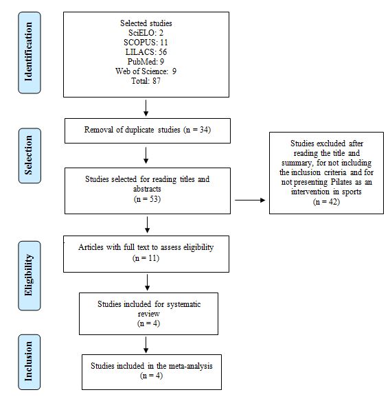 This review had as limiting factors the small number of studies, with participants of different age groups, lack of homogeneity of the sample population, as well as the variation in the protocol of experimental intervention; the non-standardization of exercises according to the chosen sports modality, among the studies, the inadequate and non-explicit sample calculation and the absence of patients' blindness, evaluators among the articles. This small number of published articles had direct repercussions on the meta-analysis, since the analyzes were carried out considering few articles. The strengths of this study were that the four studies compared the results between the groups after the application of Pilates, and the PRISMA recommendations were used to base the methodological structure and the quality of the textual presentation.