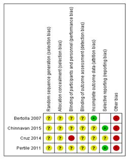 The meta-analysis and evaluation of bias risks based on the results of the articles were performed using Review Manager v. 5.3 software (Cochrane Collaboration), considering an alpha value equal to 5% to be statistically significant (95% confidence interval). Statistical heterogeneity was evaluated using Cochran’s Q test, and the inconsistency was determined by the I2 test, with 0% indicating non-heterogeneity among the studies, close to 25% indicating low heterogeneity, close to 50% indicating moderate heterogeneity, and close to 75% indicating high heterogeneity among the studies.