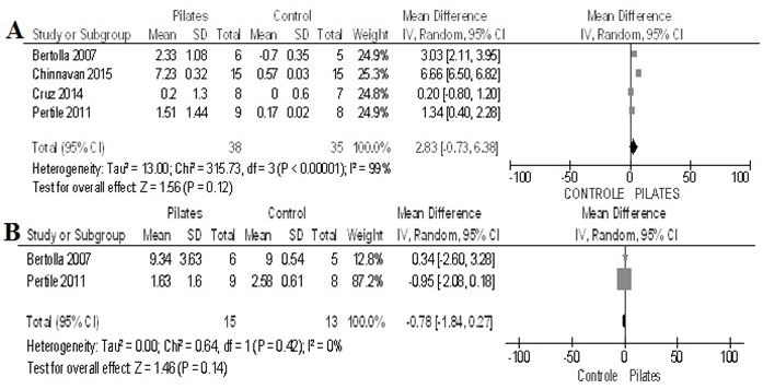 The measurements for Pilates and control groups (difference of means and standard deviations) were used, since these values were available in all the studies. Only two studies provided post-intervention measurements, which were excluded from the meta-analysis.