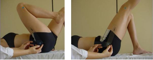 Na abdução (Figura 4) e adução (Figura 5) do quadril, o paciente encontra-se deitado dorsalmente. O braço móvel do goniômetro é posicionado sobre a região anterior da coxa, ao longo da diáfise do fêmur, enquanto o braço fixo fica sobre a linha entre as espinhas ilíacas ântero-superiores, e o eixo está na região ântero-posterior da articulação do quadril, próximo ao trocânter maior. (Marques, 2014)
