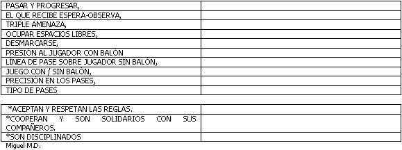 OBSERVAR: Pasar y progresar, el que recibe espera-observa, triple amenaza, ocupar espacios libres, desmarcarse, presión al jugador con balón, línea de pase sobre jugador sin balón, juego con/sin balón, precisión en los pases, tipo de pases.