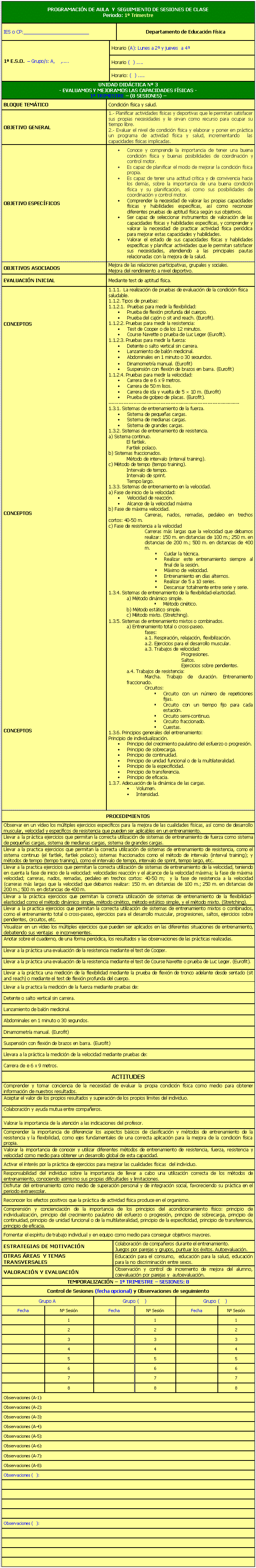 A continuación se presenta una sencilla secuenciación de contenidos, adaptada del libro de texto de Martínez de Haro (2004), correspondiente al bloque de Condición Física y Salud. Hemos preferido estructurar varias unidades didácticas, esquematizando los aspectos más relevantes, de forma que el profesorado pueda profundizar en los contenidos que desee. Igualmente se ha considerado prioritario facilitar al docente la elaboración de un cuadro de seguimiento; sobre todo, teniendo en cuenta la tendencia actual de programar cada paso del proceso educativo, así como su posterior comprobación, debiendo reflejar por escrito las incidencias ocurridas en el transcurso de cada clase. Este proceso se hace más exigente cada vez, no en vano ya han comenzado algunos centros a perfeccionar su proceso educativo con objetivo de obtener el sello de control de calidad educativa por empresas cualificadas como AENOR.