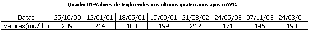 No quadro 01 esta descrito os valores de triglicérides nos últimos quatro anos após o AVC.
