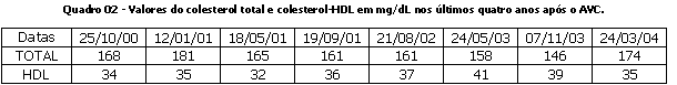 No quadro 02 estão descrito os valores de colesterol total e colesterol-HDL em mg/dL nos últimos quatro anos após o AVC.