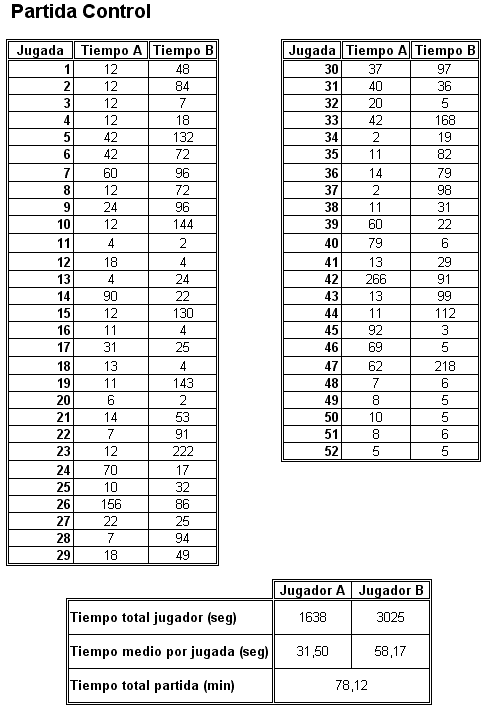 El tiempo medio empleado para cada movimiento empleado por el participante en la partida experimental (58,17 segundos) también es muy distinto del necesitado en los movimientos de la partida control (42,29 segundos), mientras que el tiempo medio del participante A ha sido prácticamente el mismo (32,25 segundos experimental y 31,50 segundos control)