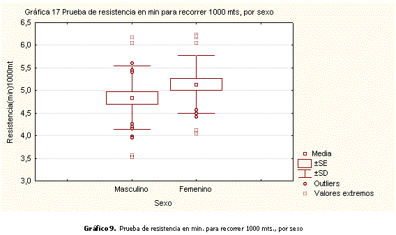 En el gráfico 9 se observa que la resistencia masculina en esta prueba es un poco mayor que la femenina pero no muy significativa esa diferencia. Los detalles se muestran en los cuadros siguientes 18 y 19.