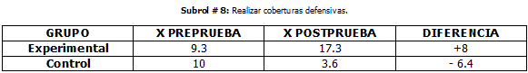 Las coberturas defensivas son de fácil ejecución, por esta razón, esperábamos una mayor frecuencia de realización en el grupo experimental; sobre este aspecto conviene advertir que la forma de jugar de los equipos infantiles dificulta un poco su realización, porque es común que en estos el balón pase fácil y constantemente de un equipo a otro, igualmente porque los jugadores en contención siempre tienen como objetivo la recuperación inmediata del balón y no se considera la posibilidad de retardar la acción del atacante en posesión del balón para que el equipo se organice defensivamente.