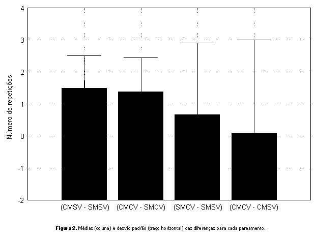 ResultadosAnalisando o número de repetições obtidas em cada teste (Figura -1), os resultados demonstram uma diferença significativa em todos os pareamentos , SMSV x CMSV (p = 0,003), SMCV x CMCV (p = 0,005), SMSV x SMCV (p=0,021) e CMSV x CMCV (p=0,042).