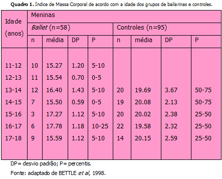 Em relação ao IMC, nenhuma bailarina apresentou sobrepeso, porém 32% estava com baixo peso, sendo que destas, 12% tiveram IMC menor que 16 kg/m². Foi verificado que apenas 2% das estudantes encontravam-se com baixo peso, e 5% com sobrepeso. Trinta e uma bailarinas apresentaram amenorréia secundária e 4 apresentavam amenorréia primária (ABRAHAM, 1996a).
