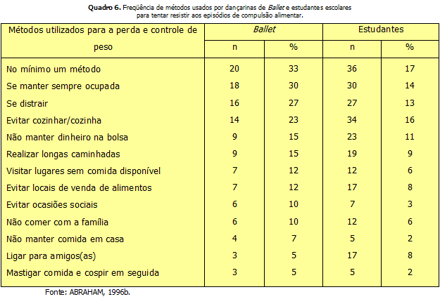 Ainda no referido estudo, no que diz respeito à compulsão alimentar, 32% das bailarinas e 19% das estudantes relataram sofrer com esses episódios. A freqüência de métodos utilizados para prevenir episódios de compulsão alimentar está descrita no quadro 6. A autora considerou que estes resultados demonstram que bailarinas são mais preocupadas com o peso corporal do que jovens que não estão em treinamento de dança ou atividades similares. No entanto, muitas estudantes do estudo apresentaram comportamentos semelhantes aos das bailarinas, o que demonstra que o cuidado e o aconselhamento são necessários para os dois grupos (ABRAHAM, 1996b).