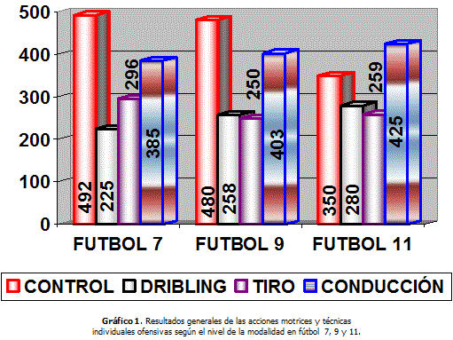 Mientras, que dentro de la modalidad de fútbol 7 se presentan características que indican efectivamente, el mayor registro global de acciones motrices y técnicas individuales ofensivas con 1398 acciones (34,07%), sobre 1391 acciones (33,90%) de la modalidad de fútbol 9 y 1314 acciones que representan el (32,02%) en la modalidad de fútbol 11, registrándose de esta manera en las tres modalidades un total de 4103 acciones motrices y técnicas individuales ofensivas. De esta manera, la modalidad de fútbol 7 estimula en mayor medida las acciones ofensivas, la diferencia con la modalidad de fútbol 9 no es tan significativa, sin embargo representa la modalidad de fútbol 7 la que promueve mayoritariamente la participación motriz con respecto al fútbol 11, justificando plenamente el objetivo y nivel adaptativo de esta modalidad al niño de 8 a 9 años y garantizando un estado de mayor igualdad dentro del juego.