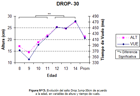 Para el Drop Jump-30 cm (DJ), se observa evolución y mejor adaptación al tipo de salto por parte de los niños de 12 a 14 años, quienes presentan diferencias significativas con respecto a los grupos de niños de 8-9-10 y 11 años. Como anota Bosco y Cols, (1980), citado por (Andrew D Walshe y Gregori, Wilson 1997), en su estudio realizado con deportistas practicantes de deportes de conjunto con edades entre 21.0 3.4 años. La habilidad para la ejecución del DJ se ve influenciada por el tipo de fibra, dependiendo del sexo y la edad como es el caso de nuestro estudio. Hay evidencia de la adaptación con el entrenamiento (Hakkinen and Komi, 1985), y el exceso de dependencia de la técnica (Bobbert et, al., 1987). No obstante en muchos estudios en común se observó que en la altura del salto precedida de un rebote aumenta el rendimiento inicialmente, pero finalmente disminuye. Por lo tanto la altura del Drop discurre y repercute en la altura del salto entonces se adapta una parábola inversa (Hakkinen y Komi, 1985). Entonces está demostrado que el rendimiento en el Drop Jump es muy relativo e independiente de la altura de la caída, ese hallazgo refleja el escaso rendimiento en el descenso desde la altura (Hakkinen et al, 1984), como también se observa en la figura nº 5 en este estudio para la altura del salto y el tiempo de vuelo en el salto DJ-40; posiblemente el rango de las alturas utilizado no es suficientemente adecuado para la tensión de cada sujeto. Bobbert, (1987).