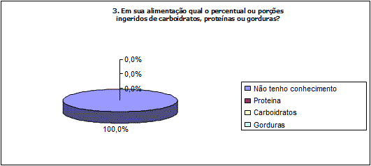 Contrapondo a resposta anterior 100% dos entrevistados disseram não ter o conhecimento sobre o percentual ingerido por eles em suas refeições, percebe-se então uma falta de conhecimento em se tratando de uma alimentação balanceada. Presumi-se que os indivíduos freqüentadores de academias de ginástica estejam preocupados com a saúde, nutrição e qualidade de vida embora essa não seja a realidade, pois algumas pessoas desconhecem estes conceitos básicos (SILVA, GEOVANI, MELO, 2005).